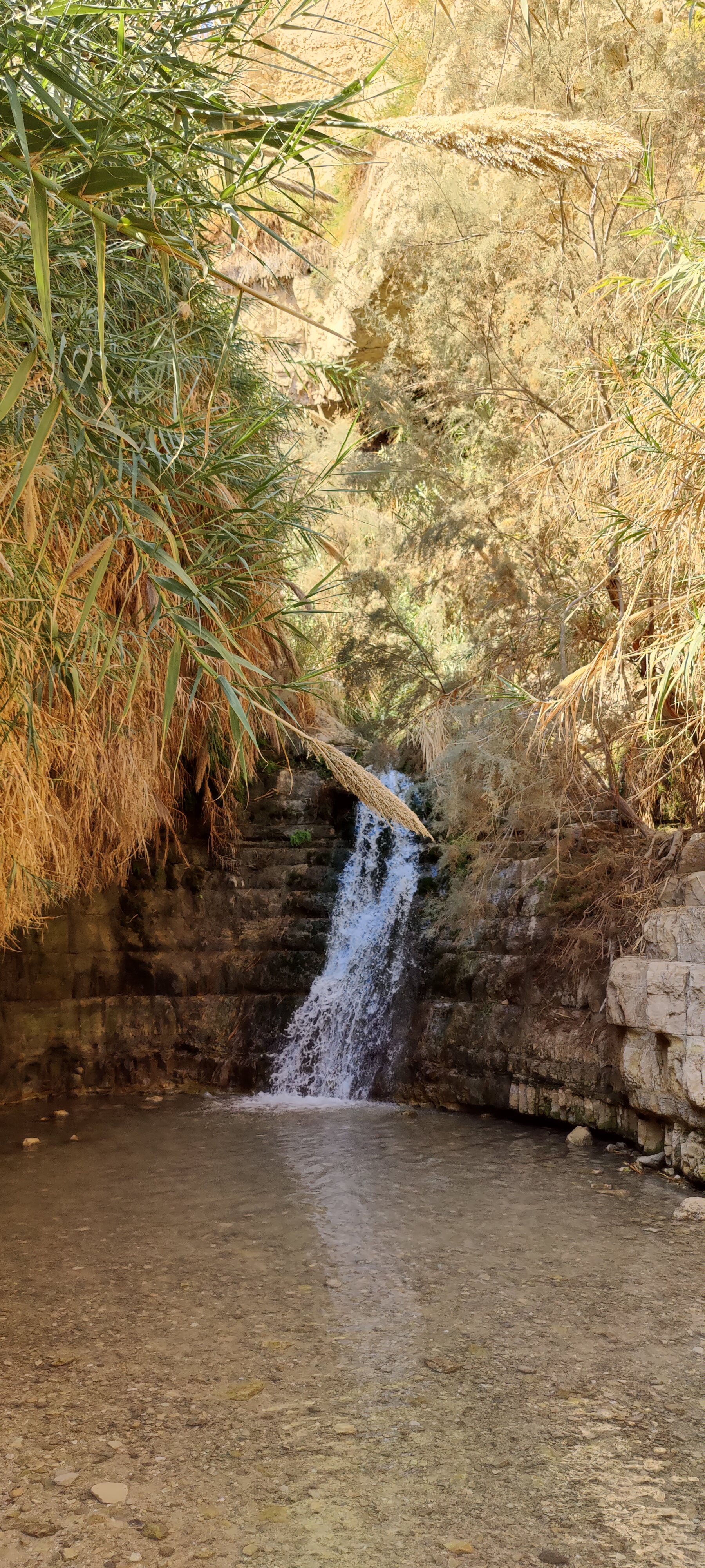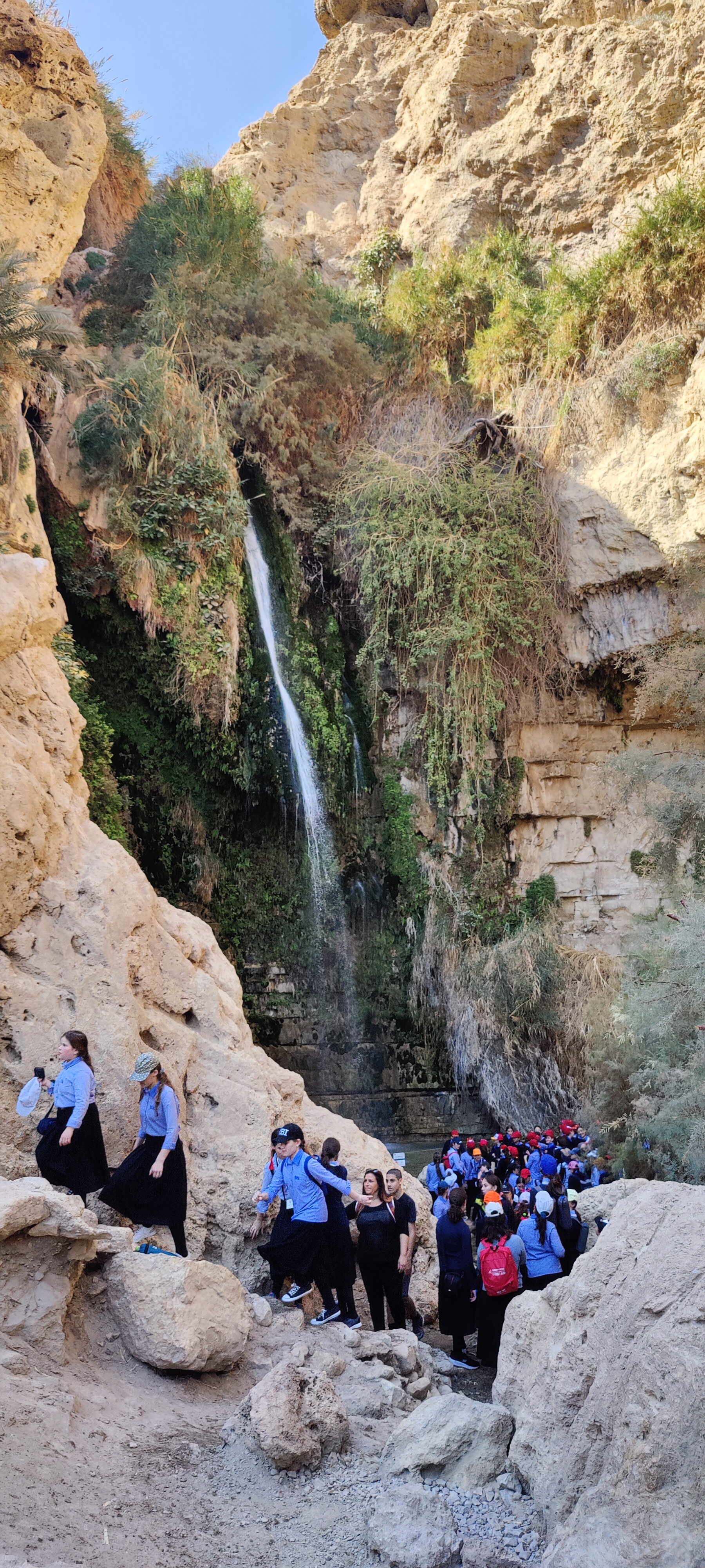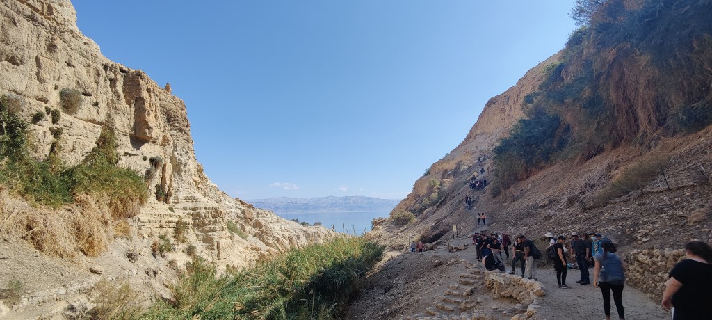 The next destination on the tour was the En Gedi Nature reserve. En Gedi is the biggest oasis in Israel. In the middle of the desert, just off the Dead Sea is a green area, which has springs and waterfalls, and flowing brooks at the foot of the cliffs. Something surreal compared to everything else that surrounds it. In one hour it’s possible to walk by some small waterfalls to the Waterfall of David. That is the most accessible even though it requires climbing some really steep natural stone staircases and going through some tunnels carved by the streams that flow through it. The waterfall itself is really narrow but nice. The local schoolchildren on the field trip were really ecstatic. I have never seen so many school groups in one place before. There are a few other springs and trails but these would take a better part of the day to explore them all. It was worth the trip as it was anyway.