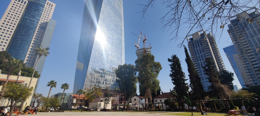 While eating I browsed different Instagram accounts about Israel and found a picture of a location nearby I decided to check out. Sarona is a neighbourhood, which started as a German Templer Colony in Palestine in 1871. It was one of the earliest modern villages established by Europeans in Ottoman Palestine. In July 1941, the British Mandate authorities deported 188 residents of Sarona, who were considered hard-core Nazi sympathizers. By the 2000s, the area had fallen into disrepair and was a haven for drug addicts. However, since 2003, the area has undergone massive renovation, which involved moving and relocating historical buildings before their restoration. The area is now a popular shopping district and a beautiful park in the middle of modern skyscrapers.
