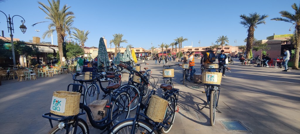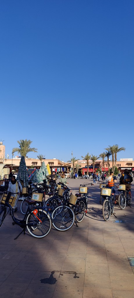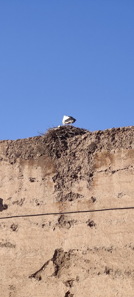 The first tour of the day was a cycling tour (pikalabikes.com). Luckily the starting point was really close and I had no trouble finding it. Arrived a little early but there were many people already waiting. As I understood, we were divided into groups based on the preferred language. Our English-speaking group of 8 ended up having at least fluent French speakers. So go figure. The bikes used were quite comfortable city bikes with three gears. After learning three hand signals for turning and stopping, we hit the road. Without any helmets or colourful vests. Now it’s probably a good time to explain the traffic laws of Morocco. Basically, there are driving lanes, traffic signs, crosswalks and roundabouts like everywhere in the world. They just are not operational. Meaning that people are driving like animals. There are animals on the road as well. Mostly chickens, cats and donkeys. The donkeys even have their own traffic sign so that they would know where they are not allowed to go with their carts in tow. And pedestrians are on the lowest level of the importance chain. Next are probably donkeys, then all sorts of bicycles, motorcycles etc, then the one Ferrari and then all the Dacias ever made. Dacia is probably the most popular car brand in Marrakech. The roads are narrow and go through the souks (or market areas) and are sometimes even somewhat paved. Going cycling through all of that was magic bordering madness. But somehow all of this works. Another wonder is that you almost don’t hear any car horns like in some countries across the Mediterranean. People are used to all the bicycles passing them while the motorcycles are passing the bicycles until there is a donkey on the way arguing with some cat about a chicken. Anyway, in two hours we drove along every imaginable type of road, made some stops, passed through the royal palace grounds without stopping (because this is not allowed), drove inside the Old Medina and also through the New Medina (where I saw the only Ferrari in Morocco) and arrived back safe and sound. Oh, I also saw where the storks go for a winter holiday. After returning the bikes, we were taken to the nearby cafeteria for refreshing cold drinks and sweets. I had already before decided to have lunch there as well, so I ordered my first Tajin of the Day, which happened to be a vegetarian one. It was delicious and so far the most expensive meal I had had here (60 MAD).