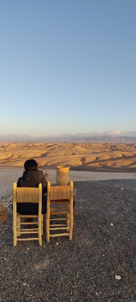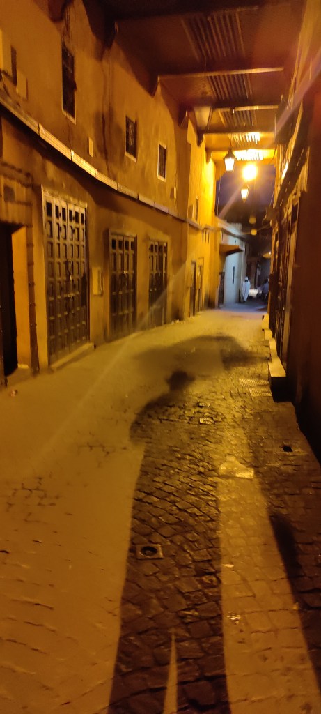 My second tour of the day started at 5PM. It was called “Dinner In Agafay Desert With Camel Ride With Sunset” (https://www.airbnb.com/experiences/2937111). It started with a drive into the desert about 45 minutes from the city centre. There were some 15 of us in the group and only three (including yours truly) had booked the camel ride. So, we were taken around about 15 minutes while the rest of the group waited. Then we were taken another few kilometres to the Alkamar Camp on the top of a hill where a restaurant tent was waiting with sweet tea and sunset. The sunset was just after 7PM and was really beautiful on this clear day colouring the desert and the Atlas Mountains in its golden glow. After the sunset, dinner was served. Everyone had to choose from different options (at least 3 or four main dishes) with some appetizers and fruit as dessert. I chose chicken with lemon and this was probably the best chicken I had ever eaten. The lemon and olives and everything just added perfectly to the taste of the well-cooked bird. The appetizers or side dishes included six types of vegetables – like potatoes, red beet, carrot, avocado and some other spicier stuff I didn’t recognize. The tables were set for two, but as I was travelling solo then I got the same amount of food as others had to share among themselves. I wasn’t complaining. The only annoying thing was the local musicians with their drums and monotonous singing. They just didn’t know when to stop. They were so loud and were moving from one table to another without missing a beat. It was just me probably because some other people were clearly enjoying them and even dancing along to the rhythm. I just wanted to escape into the moonlit night. But it was chilling outside. The deserts always are after the sun sets. The difference in temperature was colossal. Luckily there was a small fire outside where all the people were gathering for some warmth until the “mariachi” band finished and we could drive back to town. The Big Square was still busy with all the people, food and music but the streets of the Medina were already emptying with the stores closing, and merchants on the way home leaving piles of rubbish behind on the streets. It was my third day and I haven’t spotted a garbage bin yet anywhere in the public space. I will keep my eye out and report back when I see one.