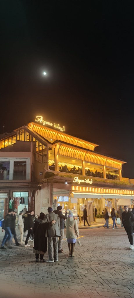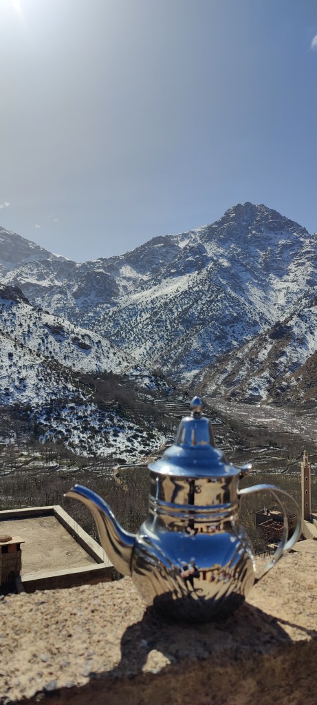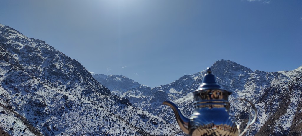 After the market, we were taken to the village centre where all the Atlas Mountains hiking trips start. Some people take it really seriously and go for many days or even weeks. There is always someone who is also climbing the highest peak in North Africa, which is located nearby. Mount Toubkal is standing an impressive 4167 m tall. We didn’t have that ambition. Our goal was to climb up to the 2000-metre mark and have lunch there. The winding trail along the mountainside took us about 1,5 hours. At the beginning there I was surprised to hear some Estonian language and find a family with at least three small children walking there as well. The guide’s home was in the last village with a breathtaking view of the mountain range. It was a beautiful clear day but so high it was quite cold and still had some snow and ice along the route. There were many people around. Some going up and some down, looking at the cascades and waterfalls or just enjoying the scenery. The home-cooked meal included again Moroccan lentil soup (this time with some additional spices for good flavour), chicken tajin with a vegetarian option and a dessert in a form of some bananas and clementines bought from the village market before. After lunch, we had to walk back down the hill. Being a little slippery because of ice and mud made it a bit difficult, but everyone made it back safe and sound. The bus was waiting for us to take us back to Marrakesh by 5PM. This time I had the evening off. No more tours. Time well used for writing this here and watching the full moon rise over the city.