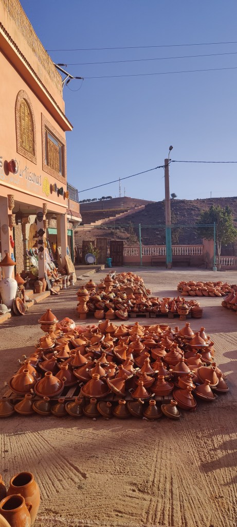 Time for another tour (https://www.airbnb.com/experiences/388245). This time to the Atlas mountains. The tour started at 8:30 so I managed to have my breakfast before that. Now I knew that I had had the “second breakfast of hobbits” every morning in the hotel including the different pancakes, cream cheese, jams etc. It was the same tour guide as the day before. This time he took us to his home village high up in the mountains. It was just an hour’s drive from Marrakesh with some stops on the way. We even followed the same beautiful mountain road that Tom Cruise used to ride his motorcycle in the Mission Impossible: Roque Nation movie. The first one was again in a local women’s cooperative. This was not as fancy as the one on the previous tour. But this time I was more ready to buy some stuff to help the local business as I knew the story already and I’m always for helping local entrepreneurs. The next stop was on a village market. This is the highlight of the local social scene. Nobody works on Saturday when there is a market happening. This is the place where the locals bring their chickens for sale and buy their weekly vegetables. And the gossip of course. Because all the buying and selling is done by men. No women participate in that.
