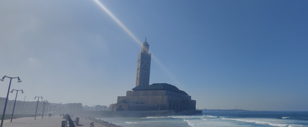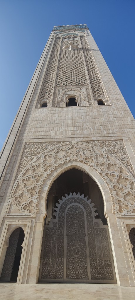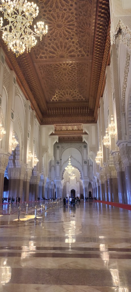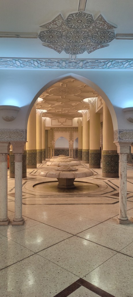 Time to check out from Marrakesh and move on to Casablanca. From Red City to White City. From inland to the Atlantic coast. From a city of 1,5 million to the biggest city in Morocco with 5 million inhabitants. But first I had to get a taxi to the train station. After negotiating the price – 70-50-60-40-50 – I reached the train station an hour before my scheduled departure. I had already bought my ticket so there was only to wait. The train’s 1st class was quite full and I was apparently lucky to buy it a day before. The train ride to Casa Voyages took 2 hours and 40 minutes. So, enough time to start and finish a short story in my Kindle. The thing to note is that today’s password in the CodyCross game was Oasis. It was Casa Oasis station that I needed to avoid just before my real stop at Casa Voyages. The long line of red taxis (Dacias of course) waited for me already and one annoying taxi driver tried to lure me into his car. Before you let anyone take your suitcase or get into the taxi you need to negotiate the price. His offer was 120 MAD. My answer was to approach the other drivers and ask them who would take me. A nice older man agreed to take me to the hotel for 50 MAD, which I was happy with. The check-in to Hotel de Paris went quickly and by 1 PM I was already unpacking my suitcase. I had also booked an introductory tour (https://www.airbnb.com/experiences/1420846) in Casablanca by 3 PM. The guide however changed the time twice during the last 24 hours so it finally started at 2 PM from outside of McDonald’s restaurant. I was only happy to combine my lunch there with the tour. A man can eat only so much lentil soup and tajin for one trip. And I could ask the Big Mac in French, which is Le Big Mac (according to Pulp Fiction). It was a private tour just for me. As the Casablanca centre is quite small and the Medina is a fraction of what it was in Marrakesh then the tour didn’t take that long at all. We managed to cover a lot of ground in an hour. Through the Medina, the fort, by Rick’s Café (the fakest famous thing in all of Morocco), along the seaside to the Hassan II Mosque. We arrived there just after 3PM. As this is the only mosque in Morocco that let non-muslims in for a visit on certain timeslots, then I was really lucky to get there at that time. The time slot was from 3-4PM. So, the guide took me quickly to the entrance and left me there to buy the ticket and have a look at that amazing building. Built only recently compared to the Koutoubia Mosque (from 1147 AD), in 1993, it is the biggest active Mosque in Africa and the 7th biggest in the world with a capacity of 25 000 people indoors. Built on the water on the Atlantic coast is a feat of its own. There were a lot of people there already and it seemed that it was good that I arrived a little later. So, I didn’t have to wait in line or anything. The place is huge. It took me some time to locate the English-speaking guide. Even though it was a big group, it took me a while to get there. After putting our shoes back on, the guide took us also to downstairs to the Hammam area, where the ritual cleaning takes place. By 4 PM we were all standing outside in the sun again in awe of the magnificence of the building.