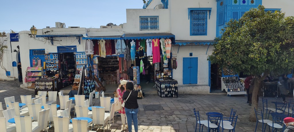 From there I took another taxi to take me some 3 km up the hill to the village of Sidi Bou Said. It’s a picturesque small village near Carthage, where they have applied the building style across the Mediterranean. All the houses are white with bright blue windows and doors (with some yellow exceptions). It’s popular among the locals as well as tourists. Walking around the narrow streets, sitting in cafes and buying stuff like local pottery is apparently something the locals are there for.